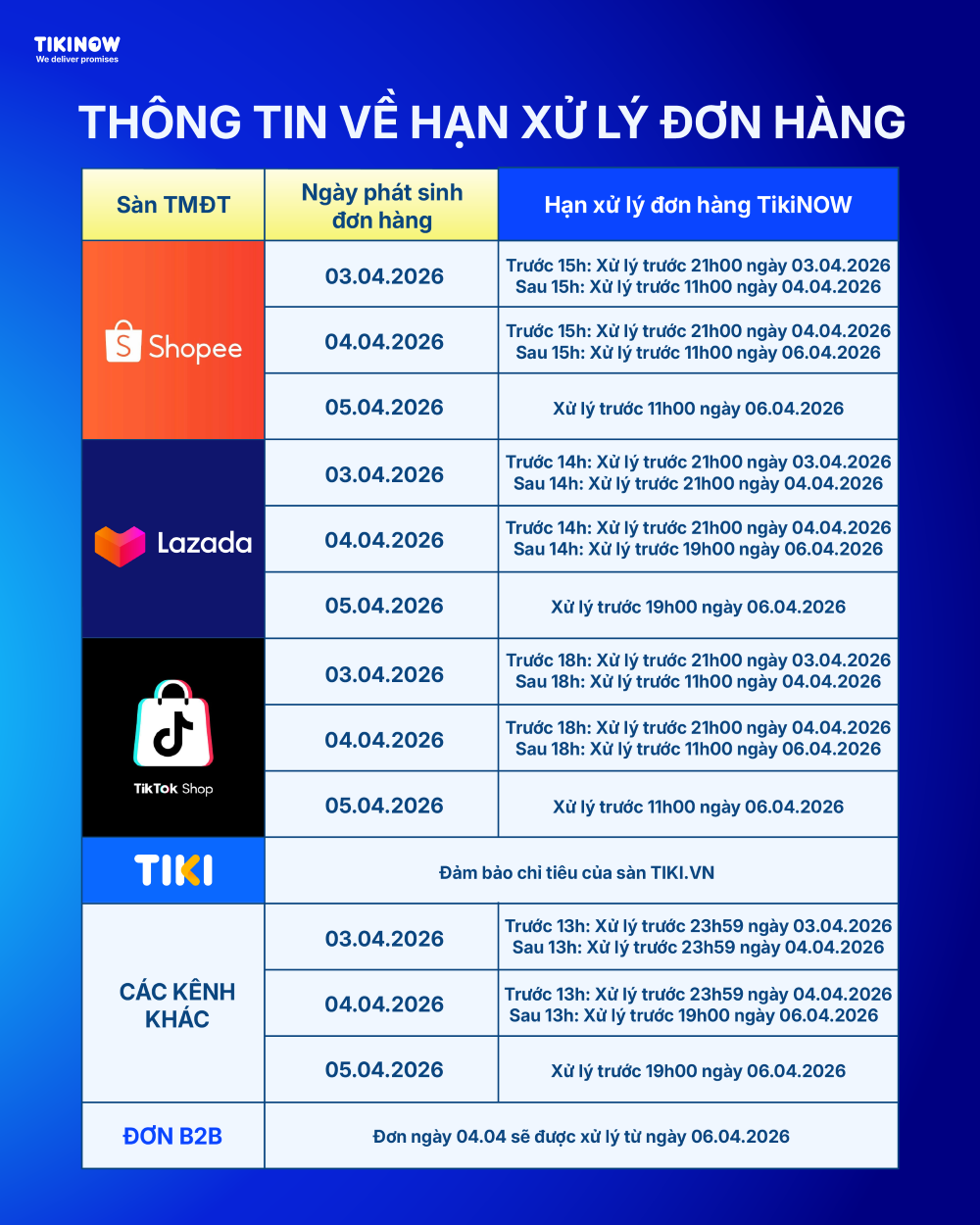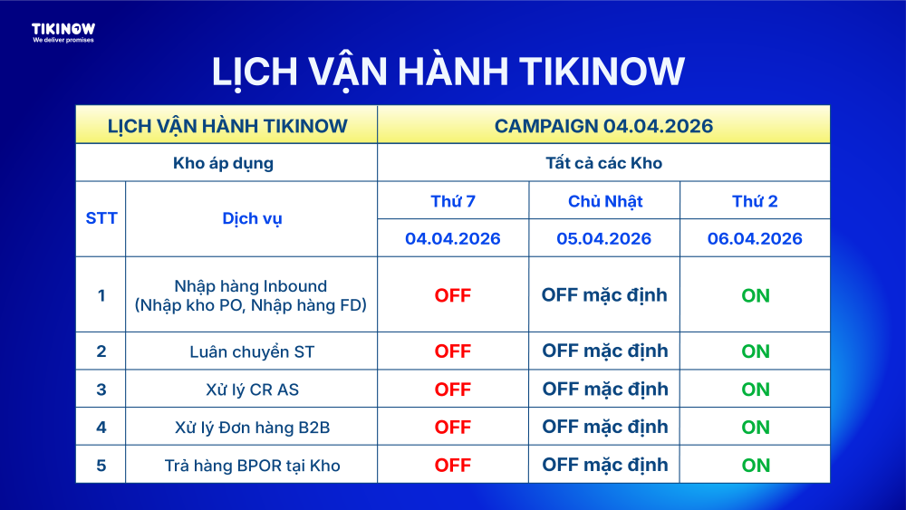 Nhằm hỗ trợ Quý Khách Hàng chủ động kế hoạch kinh doanh, đồng thời đảm bảo chất lượng vận hành và trải nghiệm giao nhận trong Campaign Tháng 04.2026, TIKINOW xin gửi đến Quý Khách Hàng các cập nhật quan trọng liên quan đến hoạt động vận hành trong giai đoạn này.