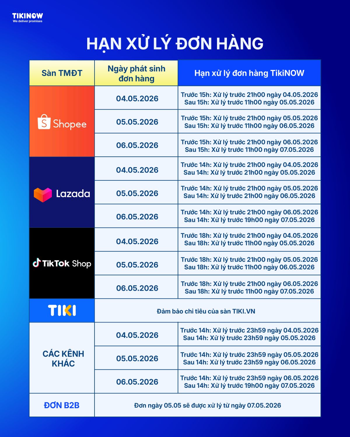 - Xử lý đơn hàng B2B: Tạm ngừng xử lý trong 02 ngày Thứ 3 (05.05.2026) và Thứ 4 (06.05.2026), hoạt động lại vào ngày Thứ 5 (07.05.2026). Với đơn hàng có thời gian xử lý trong ngày này sẽ gia hạn sang ngày 07.05.