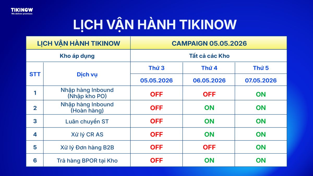 Nhằm hỗ trợ Quý Khách Hàng chủ động kế hoạch kinh doanh, đồng thời đảm bảo chất lượng vận hành và trải nghiệm giao nhận trong Campaign Tháng 05.2026, TIKINOW xin gửi đến Quý Khách Hàng các cập nhật quan trọng liên quan đến hoạt động vận hành trong giai đoạn này.